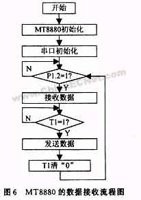 3.2 MT8880的数据接收程序设计 MT8880的数据接收程序中用到了相应的串口发送程序,其程序流程图如图6所示。